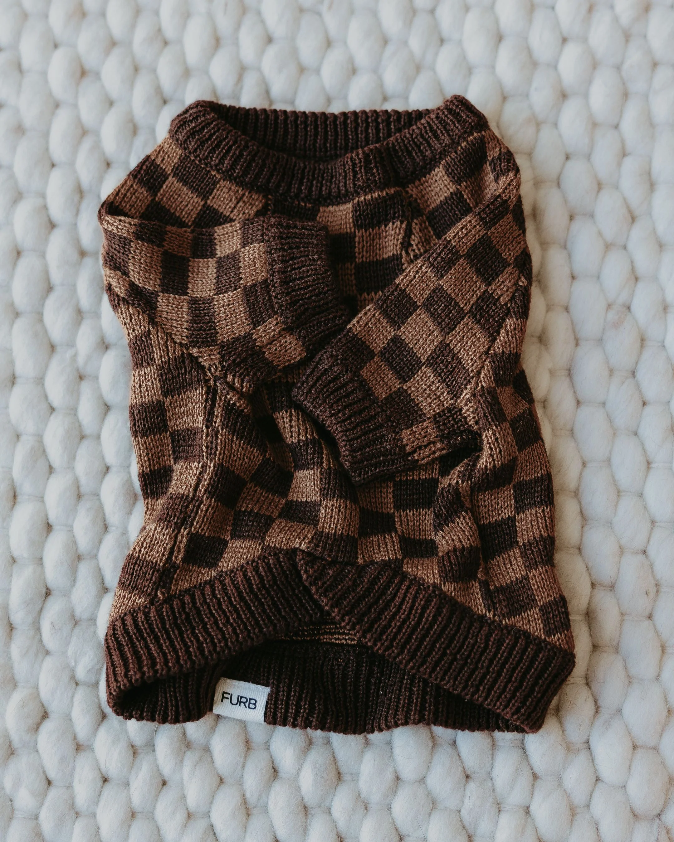 Adorn your pup in this modern take on the chic brown and tan checkerboard print, accented with brown knit ribbing along the neck, cuffs, and bottom hem, with just enough stretch for a perfect fit.